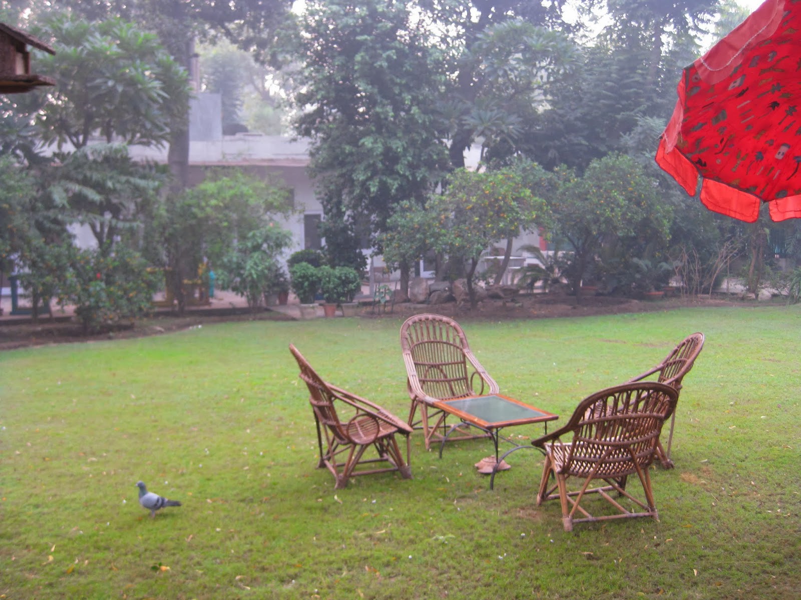 Our driver we arranged through our hotel met us at the Delhi airport(sight for sore eyes) and brought us to our wonderful oasis in the middle of New Delhi. The air here is smoggy..kinda thick, mildly humid and smells rather polluted(but not as bad as I was warned about). I have a mild smoker's cough after about 12 hours in it( Delhi air is supposed to be so polluted that breathing it in each day is the equivalent of smoking 20 cigarettes) The traffic isn't as bad as I was expecting...crazy for sure, but on a scale of 1 to Cairo it is only a 4...at least all the cars so far have had seat belts! The Hotel is beautiful...it is a small guesthouse run by a very nice and helpful lady named Shukla...we were greeted at 6am with a delicious breakfast and chai tea (Just what we needed) and we are eating dinner here tonight too.